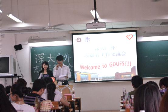 下午2点,深大广外志愿者交流座谈会在教学区E栋503正式开始。首先是由我校代表对我校亚残运期间的组织工作进行简介,并播放相关视频,介绍青年志愿者行动指导中心的日常工作。然后是深大代表播放深大宣传视频。接下来是深大外院、艺院、信工、电子等学院代表对各自学院工作,以及相应的大运组织工作进行介绍。代表们风趣幽默的语言,不时为座谈会带来一阵阵的欢声笑语。接下来的30分钟分组交流中,两校志愿者们就志愿者工作中可能出现的各种问题进行了进一步的深入交流和讨论。