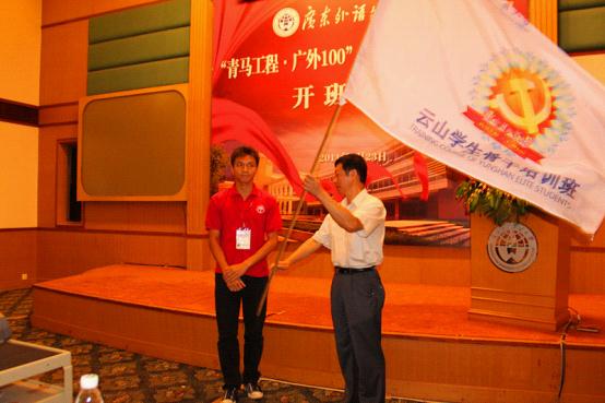 在广东外语外贸大学“青马工程·广外100”云山学生骨干培训班开班仪式宣布开始后,国歌响起。随后许国彬发表了讲话,鼓励我们的学生骨干要做坚定的马克思主义者,努力奋斗,以身作则,发挥骨干作用。随之而至的是许国彬给培训班授旗。