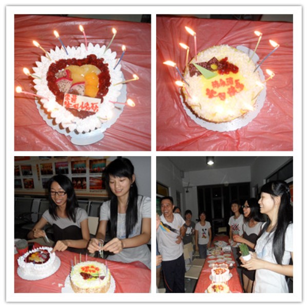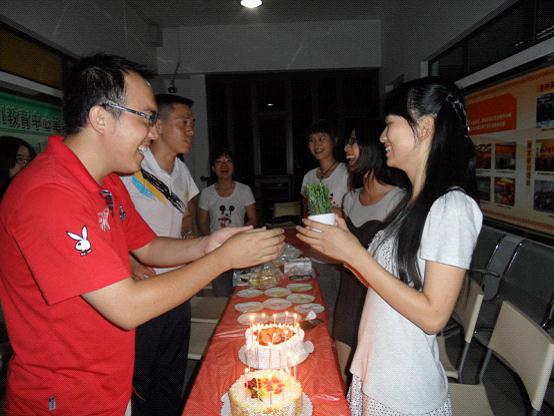 两位寿星分别是英文学院研究生一年级的陈永洁和商英学院大二的李茵。她们望着跳跃的烛光,听着队友和老师的祝福,感动得连说“谢谢”。陈兵、陈静为寿星送上生日礼物——仙人掌,祝她们面对困难时能像仙人掌一样坚强地应对各种环境。在场所有人员鼓掌并唱起了生日歌,把晚会推向高潮。