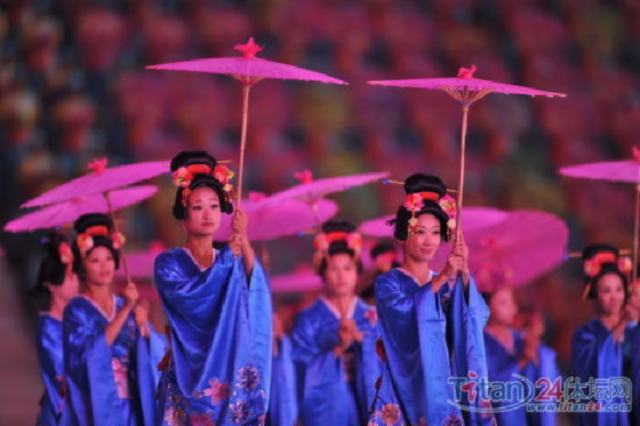 随着悠扬的旋律,演员们以线性流动向火炬台前进,在火炬台下形成半壶阵型。到位后,演员们开始了她们优美的舞蹈,轻轻的一个抬手,一个点脚,一个撑伞,一个旋转,演员们都做得非常整齐优美。