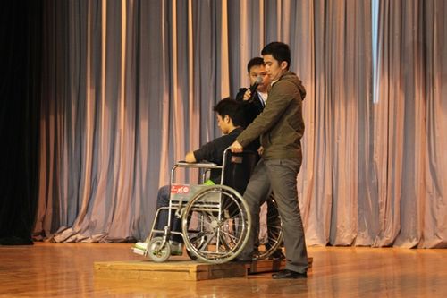最后,广州残联的赵少城老师为志愿者们讲解了对于残疾人士的特殊服务技能,并现场演示了轮椅的使用方法。他还让观众扮演盲者,实地讲授服务盲者的注意事项。最后,小赵老师还现场教授了几句简单的日常手语,让志愿者可以更好地与有听力障碍的残疾人士交流。