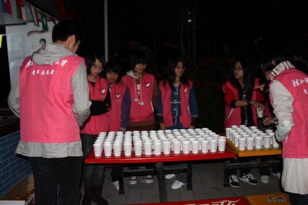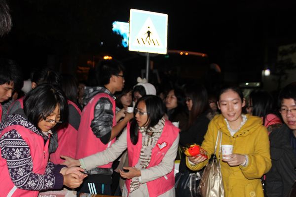 22:30,开幕式表演团队的演员们拖着疲惫的身子返回校园,而此时,服务站的工作人员早已准备就绪。为避免派发慰问品过程中出现热姜汤溅洒现象,服务站工作人员指引演员们排好次序,有序领取热姜糖水及面包、饼干等慰问品。