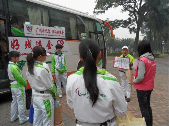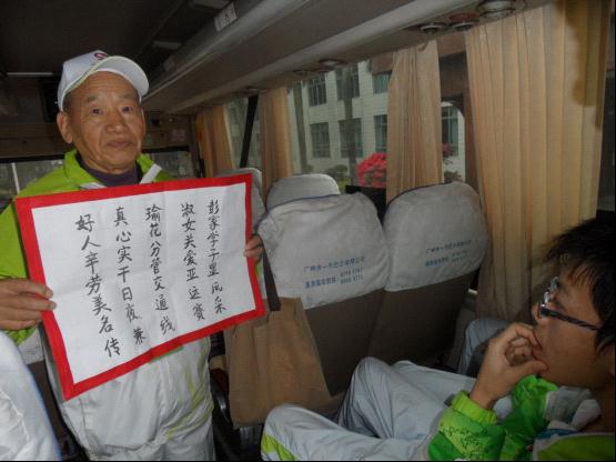很快,第一辆车出发了,程爷爷又精神矍铄地奔往下一个发车点。这一次,他走上汽车,并拿出他歌颂车辆总负责人彭淑瑜的一首名字诗:“彭家学子显风采,淑女关爱亚运赛,瑜花分管交通线,真心实干日夜兼,好人辛劳美名传”。当他介绍彭同学的感人事迹时,志愿者们都十分认真地听,并露出感动的神情,颇受鼓舞。程爷爷在动情地叙述着,而志愿者们也纷纷积极地提问。程爷爷将志愿精神播洒在志愿者们的心里,残运会志愿者们一定会把他们在亚运会中的志愿者精神无限扩大,扩大到残运会、扩大到全民。