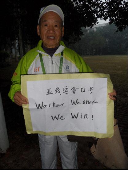 七点没到,第一班车已经准备出发了。程爷爷连忙拿出一个横幅,上面写着:“We cheer. We share. We win!”。他一见到志愿者就用满怀真诚的目光鼓励他们,让志愿者顿时精神了不少。