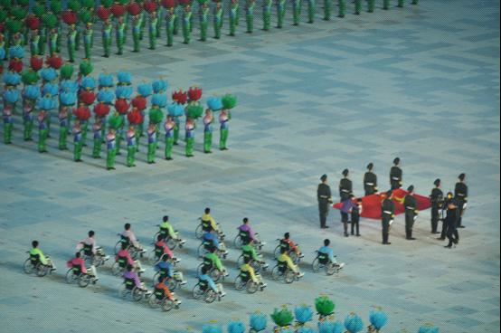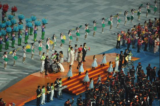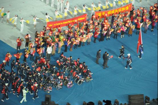 本次亚残会运动员先行入场再观看表演,这是亚残会开幕式“温情”风格的又一体现。亚组委对残疾人运动员的关怀和充满浓浓“人情味”做法博得了广泛好评。这是对残疾人的一种照顾和体贴的表现。在歌曲联唱中,运动员进场。叙利亚、科威特等国的残疾运动员坐在轮椅上耍着各种轮椅花样,在他们脸上,我们看不到一丝软弱和愁容,只有乐观和向上。