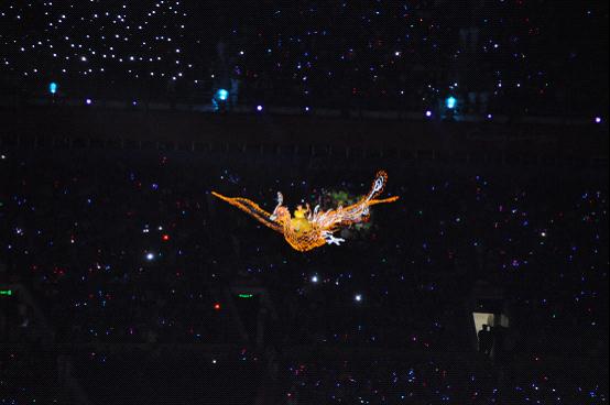 第三章《飞翔》主要由全国舞蹈大赛金奖得主马丽和霍孝伟担任主舞,随后的800男子轮椅方阵也阵势宏大。他们凸显的都是同一主题:生命如同浩瀚的大海,不会总是风平浪静。不管尽量多少磨难,人可以用自己顽强的毅力活出生命最大的精彩。像最后出现在空中的金灿凤凰,他们像涅槃的凤凰一样,也可以浴火重生!