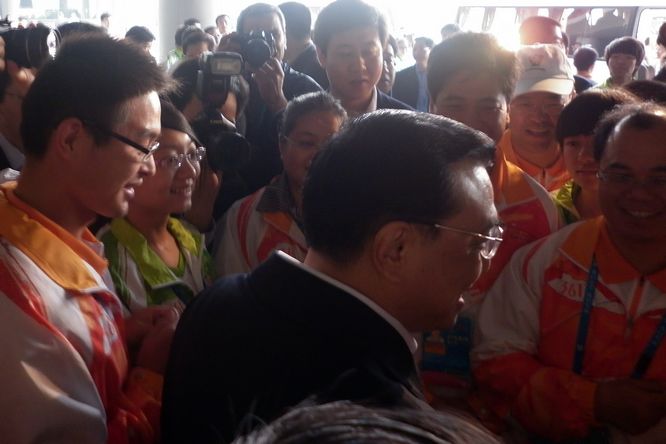 在参观体育馆毕,步出体育馆时,总理向位列两旁的志愿者问好。在场的志愿者和工作人员用更为热烈的掌声感谢总理的关心与问候。在志愿者的簇拥中,总理与身旁的数位工作人员和志愿者握手,感谢大家对亚残运会的付出,让在场的各位激动不已。期间,他还问起制服上“361”的标志,并套用其广告词勉励在场的工作人员及志愿者对亚残的工作要“多一度的热爱”。