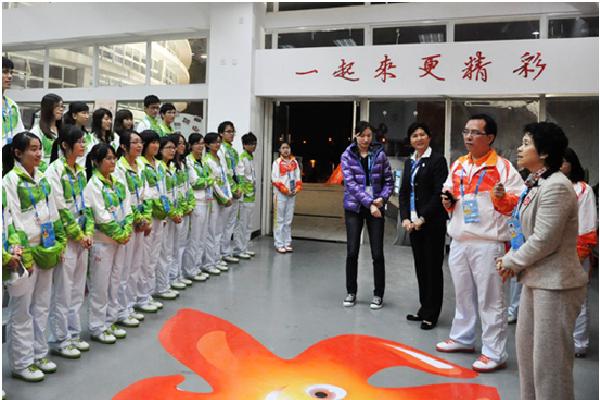 本网讯 12月14日晚上,在广外亚运场馆人力资源经理何越晖的陪同下,亚组委志愿者部副部长林燕芬和亚残运会组委会志愿者部招募调配办副主任、世界羽毛球冠军谢杏芳率领全国自强不息好青年代表团参观了我校场馆志愿者之家。