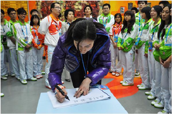 参观完志愿者之家后,林燕芬与谢杏芳分别为志愿者之家题词。在题词本上,林燕芬这样写道:“感谢你们辛勤的付出,亚残会有你们而更精彩。”而谢杏芳则写道:“你们是彩虹,你们是阳光,为广州亚运、亚残运会大放光芒。广外志愿者,加油!”