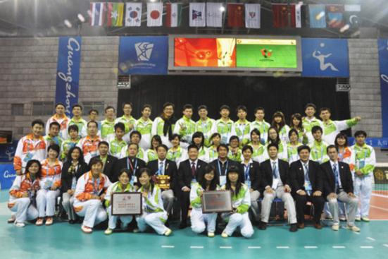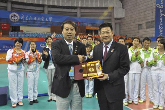 本网讯 12月15日晚上,当天最后一场比赛结束后,国家体育总局排球运动管理中心处长、场馆竞赛主任蔡毅与广外亚运场馆执行主任、我校校长仲伟合以及团队服务副主任、副校长陈子锐亲切握手,并向我校及我校场馆团队赠送了牌匾:赞扬我校“组织严谨,保障有力,服务亚运,共创辉煌”和我校场馆团队“亚运结缘,排球会友,两个盛会,精彩无限”。而仲伟合也代表学校送给蔡毅一份精美的纪念品。