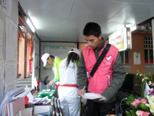 今天是2010年12月17日,离亚残运会的结束只有两天。可广外志愿者服务站仍在继续,服务站的工作人员顶着严寒工作在二线。