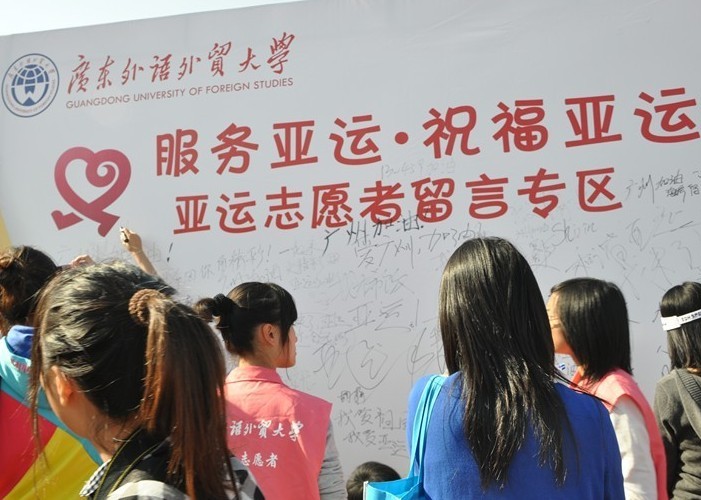 (文:陆成珍 陈竹 图:校团委宣传部)2010年10月28日下午,广东外语外贸大学亚运会、亚残运会志愿者誓师动员大会在南校区图书馆前广场隆重举行。为表达对亚运的祝福和给志愿者留下美好的回忆,我校为参加本次大会的志愿者提供了“服务亚运,祝福亚运”亚运志愿者留言专区,供志愿者留言,说亚运,写精彩,写下自己心中最想要说的话。