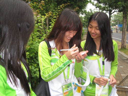 清晨6点,天色未亮。工作站值班人员便已悉数到场,准备前期工作。随后,亚运志愿者陆续集中。天公不作美,风雨不绝,但却无法熄灭志愿者们的热情。他们统一穿着志愿者制服,远远望去,汇成一汩白色浅流,其间缀以绦绦新绿,更衬出志愿者们意气风发,勃勃朝气。更有志愿者玩笑道:“我们就像勤奋的小白菜。”当论及这么早起床,是否有怨言时 ,来自思科信息学院的连同学笑答:“我们所做的都是为了奉献亚运,服务亚运,这点辛苦算不了什么的。”谈笑间尽显一个志愿者的精神风貌,更表现出对志愿服务的坚定无悔。等车间隙,志愿者们在服务站便利贴上写下了对自己服务岗位的期待和此时此刻此景的心情。 七点左右,运送大巴接连发动。轰鸣的发动机声仿若宣告一个讯息——启程时间到了,亚运就在前方!