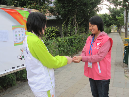 志愿者郑重地将徽章送与工作人员 (责任编辑:校团委宣传部) |
