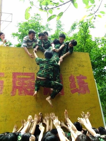 那次,他们面对着约四米高的“毕业墙”,只有每个人都翻过了才能算过关。经过讨论,男生们扎马步叠成了两层人墙,让女生踩着他们的肩膀翻过去,另外几个男生在上面拉,最后男生再一个个翻过去。由于难度高,而且有一定的危险,大家都紧扣心弦,全力以赴。当看着最后一个人顺利翻过,教官让一个男生把上衣脱掉。当这个男生露出红肿的肩膀时,不少女生的眼眶偷偷地湿润了。