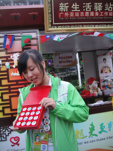 随后,胡静娴同学对上海第二工业大学纪念章做了详尽的介绍,并与大家分享了她对亚运服务的心得体会。她提到,上海世博会的城市志愿者有大学生、企业家、老年人等,而亚运城市志愿者则多是大学生,这更显得年轻、激情,同时也响应了广州亚运这场激情盛会的主题。此外,胡静娴对广外自制的志愿者工作手册也称赞有加。