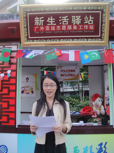 胡静娴同学是上海第二工业大学的团委新闻部部长,前不久参与上海世博会的志愿服务工作。亚运期间,她作为《中国青年报》的一名大学生记者,服务于天河体育中心,日前已圆满地完成各项工作。