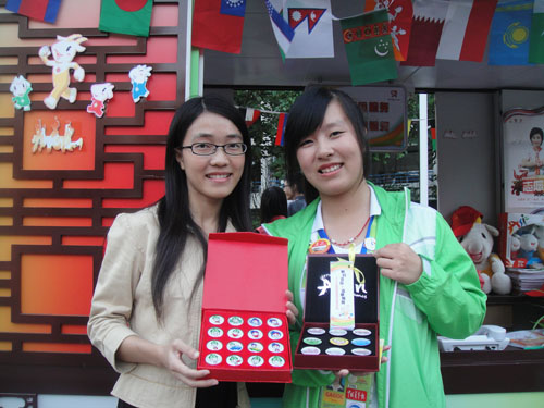 之后,服务站副站长纪纲同学与胡静娴同学互换了各自学校的纪念徽章,双双祝福亚运会的圆满结束、以及亚残运会的顺利举办。