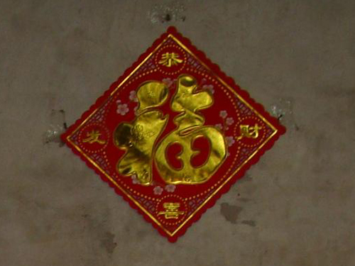 一个大大的福字贴在小小的厅堂墙上正中央