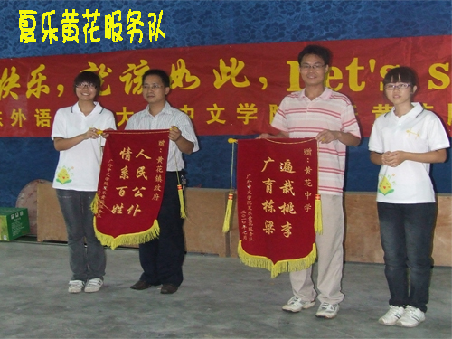 文艺汇演开始之前,队长彭倩菁走上舞台,向即将分别的当地领导和学生们发表告别辞。在致辞中,她深情地回溯了夏乐队在黄花镇所走过的每一个日子,所印下的每一个足迹。义教组课堂上的欢声笑语,挂职组办公室内的兢兢业业,运动会的加油呼喊,知识竞赛的强强对决,篮球赛的潮爆扣篮,调研活动和惠民活动时在岩背、在平星、在黄花镇中心乃至黄花的每一寸土地的滴滴汗珠与串串足迹……一幅幅回忆的画面相继展开,台下的领导、学生和夏乐黄花队的队员们在队长的讲述中品味的过去的13天。随后,为表达对黄花镇政府和黄花中学的感谢,队长分别向黄花镇政府党政办陈主任和黄花中学梁振列副校长赠送锦旗。随后,文艺汇演正式开始。