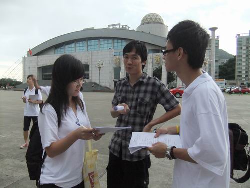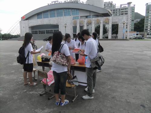 下午5点20分,“梦不落”服务分队的队员来到了既定的宣传地点——斗门体育馆广场。一到达目的地,队员们便开始布置摊位,十几分钟后,宣传摊位就已经摆设好了。这次宣传活动的主题是“‘梦不落’服务队与你携手亚运”,活动的主要形式是有奖竞猜和派发传单。另一方面,我们了解到,每天傍晚附近的居民都会到体育馆散步,所以,调研组的组员们也抓住时机,在协助宣传组开展宣传活动的同时着手做问卷调查。