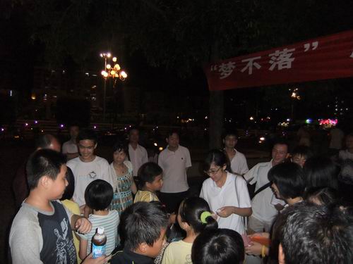 一番讨论后,队员们决定改变策略,除两位队员在摊位驻守外,其他队员主动出击,拿着宣传单到附近的街道派发。晚上7点,雨后的广场格外凉爽,散步的居民也越来越多。“梦不落”的队员们再次召集,拿着喇叭,对着过往的人群发起一波又一波的猛攻,不一会儿,我们的宣传摊位被人群围得严严实实的,老人、青年、小朋友,连旁边的小贩都参与到我们的有奖竞猜活动中。队员们几乎忙不过来了,他们高涨的热情感染了在场的每一位民众。