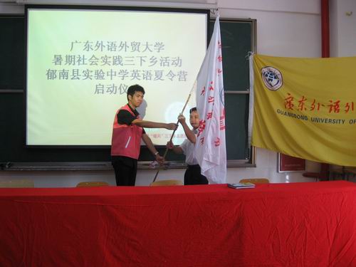 7月21日上午,广东外语外贸大学四团暑期社会实践活动三下乡队伍中的暖风服务队的三下乡活动启动仪式在郁南实验中学举行。启动仪式由实验中学团委副书记彭海龙主持,实验中学团委委员卢文通,暖风服务队全体队员和参加此次活动的学生出席本次仪式。