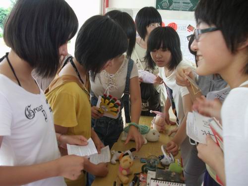 而在“模拟交易会”期间,四个班的学生各分成了四队分别进行买卖双方的交易。十六队学生参与热情高涨,很多队伍都展现了他们的英语风采。在交易进行中,监督人员经常被问到还诸如“跳楼价”、“买一送一”、“走过路过千万不要错过”等的俗语的翻译,虽然有点难度,但是监督员们对于学生的主动提问都十分欣赏。