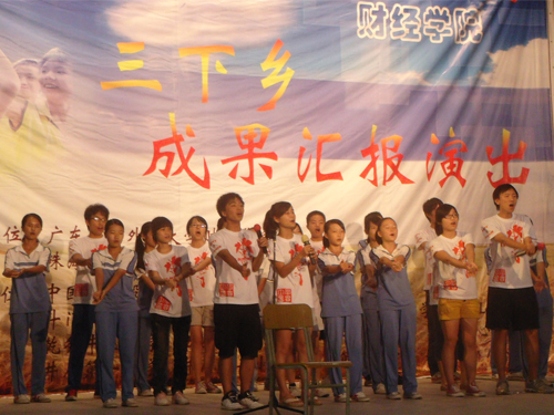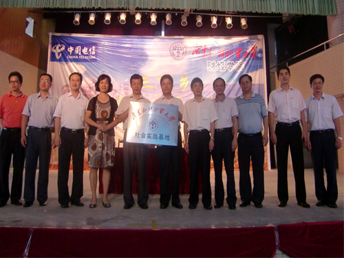 2010年8月1日下午两点三十分,广东外语外贸大学社会实践基地签约仪式暨财经学院三下乡成果汇报演出在珠海市斗门区实验中学隆重举行。莅临本次活动现场的领导广东外语外贸大学党委副书记许国彬、教务处处长詹文都、校团委书记刘志军、学生处副处长李和民、财经学院党委书记周东兰、学院党委副书记许志超、珠海市教育局林小荣主任、珠海市斗门区委常委李奕根、区教育局局长鲍国汉、团区委书记杨勇、区教育局党委书记罗伟略,以及斗门区十三所中小学的领导老师。