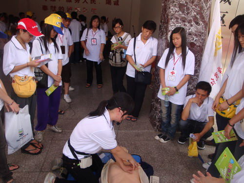 随后,广州市红十字会培训中心的老师向队员们讲授了有关急救自救的知识,并指导队员们进行了心肺复苏和止血包扎的模拟分组训练。