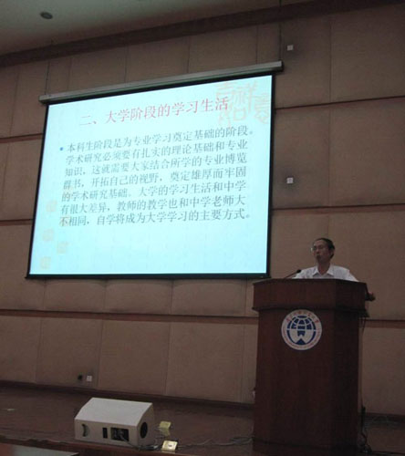 紧接着,杨韶刚教授对同学们现在和将来所在的四个不同年级、以及有意考研或出国的同学提出了相应的具体的要求,希望同学们能够打下扎实的学术基础、扩展自己的知识面、奠定良好的人际关系、培养参与社会生活的能力,并且以邓小平的名言“发展才是硬道理” 激励大家要一直努力、不断进步,“就算是做农民,也要做世界一流的农民”!