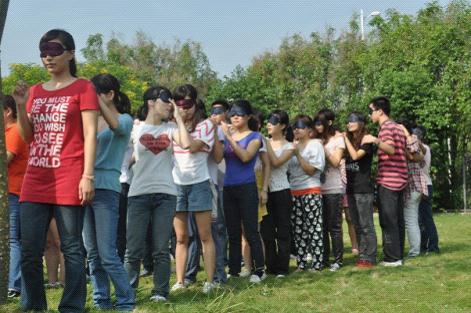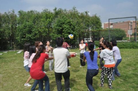 游戏环节,各组在培训师的带领下分别了进行“鼓动人心”和“七巧板”两项素质拓展游戏。“鼓动人心”,即用十五条绳子连接着一个鼓,每人各牵着绳子一端,通过集体发力,用鼓面垫排球。表现最为突出的是梦飞队,该队志愿者在该游戏中实现了一次又一次的突破——从最初的7下到最后的126下,队员间的默契在不知不觉中建立起来,士气也随之高涨。在训练的过程中,志愿者不仅培养了团结合作精神,还收获了友谊。