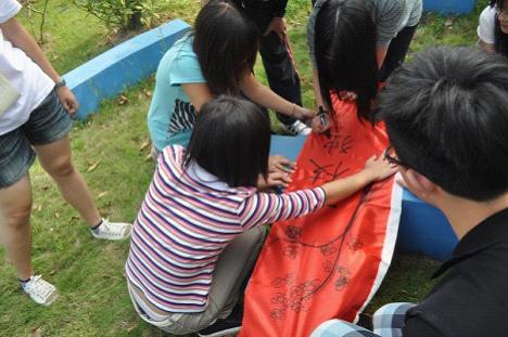 随后进入的“团队建设”环节,志愿者需在二十分钟内时间内设计好队名、队徽、队歌以及口号,并在一面红旗上展示出来。各组志愿者集思广益、各显其能,迅速完成了本环节的任务,设计出的队名或古典或激扬或搞怪,但无不彰显青春活力。