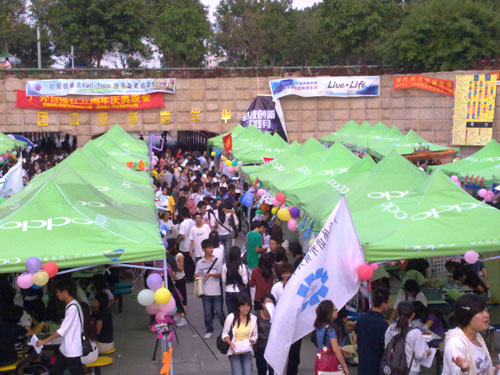 (文字:陆成珍 图片:韩淑贤 编辑:胡秋玲)2010年10月21日下午14:00,广东外语外贸大学“LIVE&LIFE”2010学生团体招新嘉年华在南校区隧道口广场精彩上演。51个学生团体联合招新,为大一新生提供了一个巨大的活动平台,也提供了多样化的选择。各个团体通过精心准备的演出以及新奇的招新方式,赢得了大批大一新生的青睐。