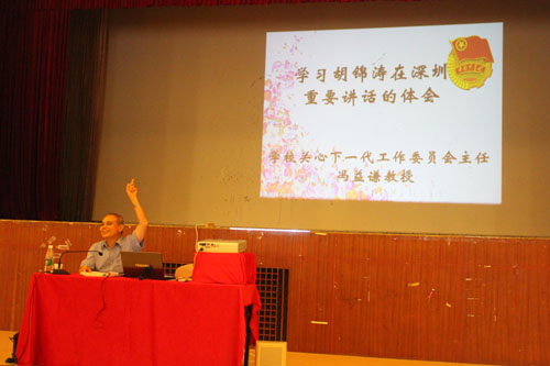 第二个讲座由学校关心下一代工作委员会主任冯益谦教授主讲,以“学习胡锦涛在深圳重要讲话的体会”为出发点,为同学们上了一节扎实的理论课。
