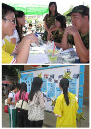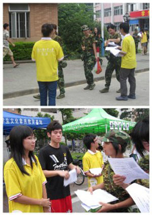 在北校区的校道上,前来咨询的新生络绎不绝。中午和下午的军训一结束,四团咨询的摊位上便挤满了前来咨询的新生。他们都热情高涨,纷纷向自己想加入的部门的工作人员咨询和索要报名表。他们表示希望通过参加社团活动丰富自己的大学生活,积累工作经验。