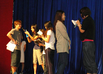 下午,依涵带领志愿者们进行了模拟采访。模拟场景是在天河体育馆,林丹与陶菲克相遇半决赛,最终林丹在第一场5:21大比分落后的情况下连扳两局,赢得比赛。同学们被分成三组,扮演AGNS、新华社、中央电视台记者,分别用英语、汉语、日语和印尼语对另一些同学扮演的林丹和陶菲克进行采访。