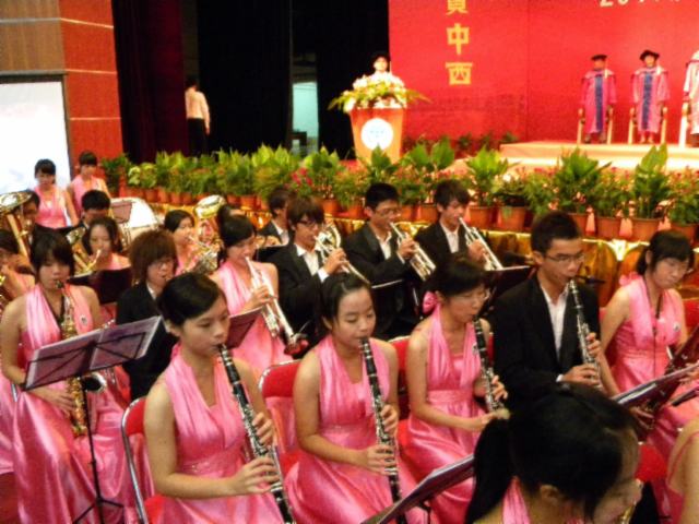 2010届本科学生毕业典礼暨2010年学士学位授予仪式6月26日-28日分别在南北校区举行。其中,我校艺术团体管乐团和礼仪队参加了其中的奏乐与礼仪工作。授予仪式当天,管乐团及礼仪队都准时6点半在大会堂集中练习。在长达一整天的工作当中,管乐团和礼仪队始终保持着应有的专业精神风貌协助授予仪式的顺利完成。