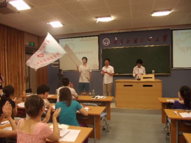 紧接着是三下乡的队旗授旗仪式和队长代表发言。刘志军书记将队旗授予校级四大团体云浮市郁南县蔡朝昆中学服务队队长谢宇晶同学,他接旗后转身面向在场的同学摇动手中的旗帜,现场随即响起了3秒钟的掌声。