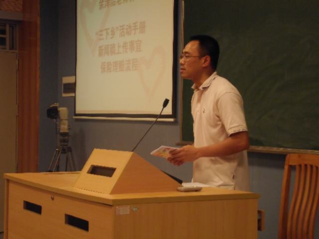 在校团委青年志愿者行动指导中心实践活动组织团队项目主管谭哲介绍会议流程后,校团委指导老师余泽浩就《2010暑期社会实践活动手册》讲解新闻稿上传事宜及保险理赔流程。为了让外界了解“三下乡”情况并为大家提供便利,校团委青年志愿者行动指导中心为暑期实践活动队伍专门提供了两条投稿通道,除了可以在团学时空发布新闻稿件以外,还可以在广外新闻网投稿。余泽浩老师特别强调一点即下乡队成功注册用户名后,应及时把用户名发送到指定邮箱。