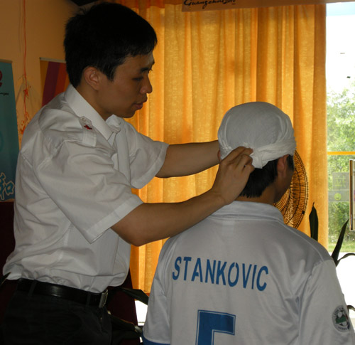 志愿者帮助前排同学放松精神