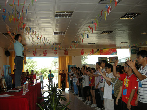 在一个半小时的车程后,我们进驻到从化喜乐登培训基地,正式开始了此次培训,主办方举行了简短而又隆重的开班仪式,出席开班仪式的领导有亚组会志愿者部培训研究办公室项目主管阮楚山、郑莹,黄小容等,由阮楚山老师宣布开班,并对同学们提出了培训期间的几点要求。随后,班主任郑莹老师介绍了此次培训的大致流程安排,并强调志愿者骨干是从赛会志愿者10%中挑选而出,希望志愿者骨干们能够珍惜此次培训机会。随后,黄翠涓同学代表志愿者骨干上台发言,梁山同学从郑莹老师手中接过了培训锦旗,接下来郑莹老师也亲自教授同学们行志愿者礼和歌曲“一起来更精彩”的手语版。