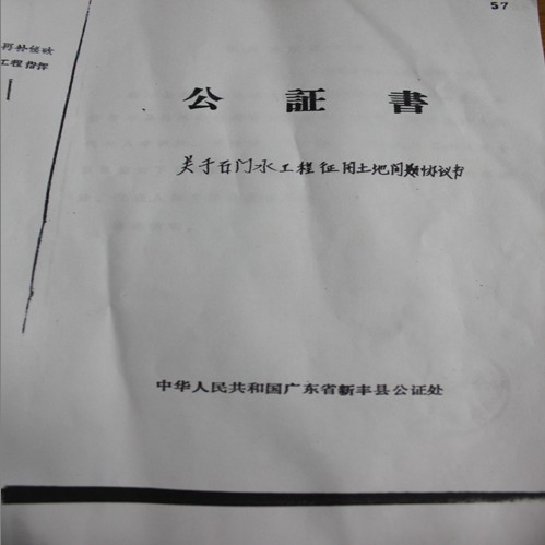 从老人口中我们得知,很多年前他所在的梅坑公社梅坑大队与新丰县石门水电站工程指挥部签订了一份协议书,生产大队的土地被工程指挥部征用,工程指挥部给了他们四年的补贴。由于他们文化水平较低,在当时没有对四年之后的相关补贴及土地使用权在协议上做规定,四年后,水电站被政府转手给了一个大老板,从此他们应得的利益便无从讨起。这些年,老人想过很多办法,但是水电站老板的强硬、律师的敷衍、政府部门的推脱、信访部门的不受理,令他倍感心寒。老人将当年的公证书拿到了我们面前,希望我们能够想想办法帮助他,将事情曝光出来,让大众来评评理,给他们一个公正的交代。