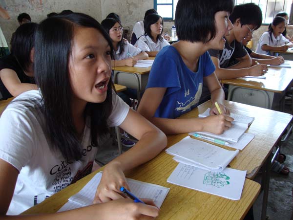 自我介绍完后,看看手表离下课还有15分钟。“嗯,我了解到大家真的很好学,能在这么炎热的暑假从那么远的地方来上课,大家可能学习英语的条件没有在城市的孩子们好,但大家这么认真,这么想把英语学好,我想,有了这颗心,大家一定可以把英语学好的。我们也会尽我们最大的努力去做好。我希望与大家做朋友,我们课下可以好好交流,我教你们知识,你们可以教我客家话啊。”