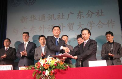 (文字:陈嘉辉 田原 图片:田原)3月11日下午,新华通讯社与广东外语外贸大学合作签字仪式暨亚运会赛时新闻服务项目宣讲会在北校区六教学术报告厅隆重举行。团委书记刘志军主持了此次仪式。新华通讯社广东分社党组书记、社长杨春南,广外大校长隋广军,新华通讯社亚运会新闻服务项目秘书长、专家组组长徐济成,新华通讯社亚运新闻服务专家叶兴增,新华通讯社亚运新闻服务专家组副组长陈越,新华通讯社亚运新闻服务运营负责人何惠飞,广外大副校长刘建达,新华通讯社亚运新闻服务核心团队以及经贸学院和新闻学院的老师出席了本次活动。