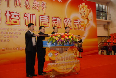 4月15日下午,“赏亚运风韵,展志愿风采”——第九届中国艺术节志愿者招募培训启动仪式在华南师范大学(石牌校区)手球馆隆重举行。“九艺节”广州筹委办主任、广州市文化广电新闻出版局局长陆志强,“九艺节”广州筹委办常务副主任、广州市文化广电新闻出版局副局长张润华,团市委副书记、亚组委志愿者部副部长魏国华等领导出席了启动仪式。启动仪式上,我校等单位被授予“第九届中国艺术节志愿者招募培训示范基地”及“九艺风韵志愿传播队”队旗;倪惠英、谢杏芳、傅靖祺、李佳、彭新智等文艺体育界知名人士获颁“九艺节”荣誉志愿者。