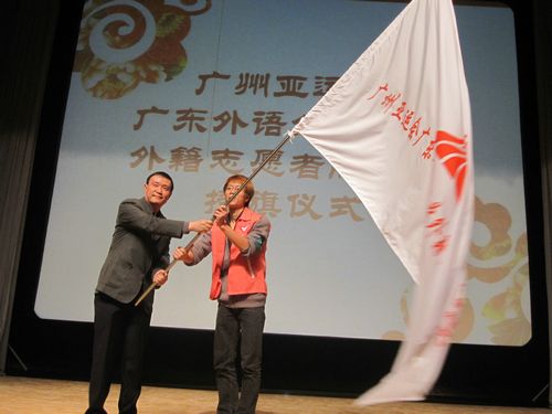 纪念大会后,广州亚组委志愿者部招募调配办公室主任傅航为广州亚运会广东外语外贸大学外籍志愿者服务队授旗,这也标志着广州亚运会首支高校外籍志愿者服务队正式成立。据悉,为满足各国友人参与亚运、服务亚运的愿望,充分体现广州亚运会、亚残运会志愿者的广泛性和代表性,亚组委决定招募一批外籍人士参与亚运赛会志愿服务工作。广东外语外贸大学作为国际化特色鲜明的教学研究型大学,按照亚组委工作要求在校内招募30名外籍人士,并组建了广州亚运会首支高校外籍志愿者服务队。届时这批外籍志愿者将活跃在亚运赛会现场,为“激情亚运、和谐亚洲”增光添彩。