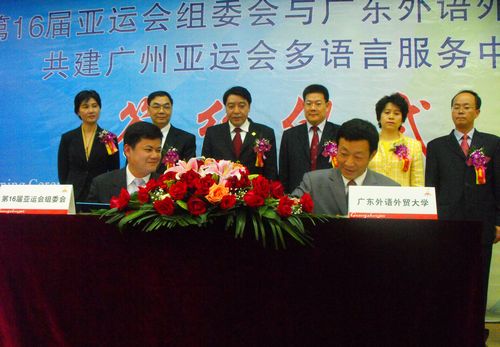 (文字 刘李珍 图片 黎星宏)2010年4月26日晚,在2010年广州亚运会倒计时200天的重要时刻,第16届亚运会组委会与广东外语外贸大学共建广州亚运会多语言服务中心签约仪式在广东外语外贸大学白云校区图书馆学术报告厅举行。广州市副市长、广州亚组委常务副秘书长许瑞生,广州市政府副秘书长、广州亚组委副秘书长古石阳,广州亚组委外联部副部长黄卡,广州亚组委志愿者部副部长林燕芬,中国电信股份有限公司广东分公司亚运办公室主任苏文桂,广东外语外贸大学校长仲伟合、党委副书记许国彬出席仪式,来自广东外语外贸大学的近300名亚运志愿者参加了本次活动。