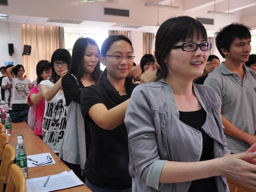 李霞老师一上场就给了志愿者们一个美丽的笑容,她告诉志愿者:“我看大家都很困,其实我自己也很困。我能理解大家,但是还是希望大家能够提起精神来。”为了给大家提神,李霞老师还让志愿者们交换着给身边的人按摩。贴心的话语,关切的眼神,舒适的按摩让志愿者的情绪一下子升到了一个新的高度。