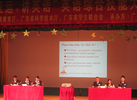 (文字:陈嘉辉 胡秋玲 图片:田原 编辑:田原)由共青团广东省委员会、广东省教育厅、广东省科学技术厅和广东省学生联合会主办,广东外语外贸大学承办的第四届广东大学生科技学术节之 “迎亚运,讲英语”英语综合技能大赛暨英语普及活动,于6月20日在我校北校区六教报告厅拉开帷幕。广东省学生联合会执行主席刘茹楠,团省委学校部的欧江和广外大团委书记刘志军出席了本次会议。华南理工大学黄运亭教授、第二师范学院教授许瑞芬、广东商学院教授杨蒙、苏红担任大赛评委。